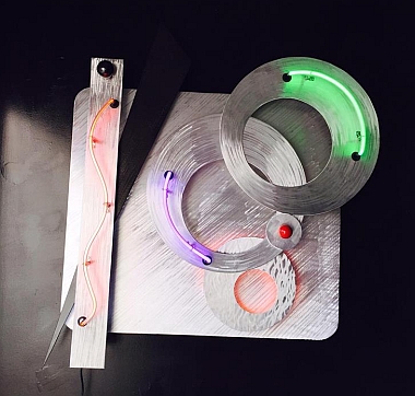 Jack In The Box has great neon with cool cirlce shapes nad contrast. With purple neon on one layer and the red neon on the other. These neon sculptures have quit a different look at day and at night. The glowing neon bounces off the brushed Aluminum and the walls to create a wonderful neon glowing effect. The squigley neon piece reall gives this piece a unique neon look. The Aluminum in this piece just thinks its a Jack In The Box.