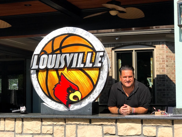 2 signs arched to make the Louisville and Cardinals look like they are floating